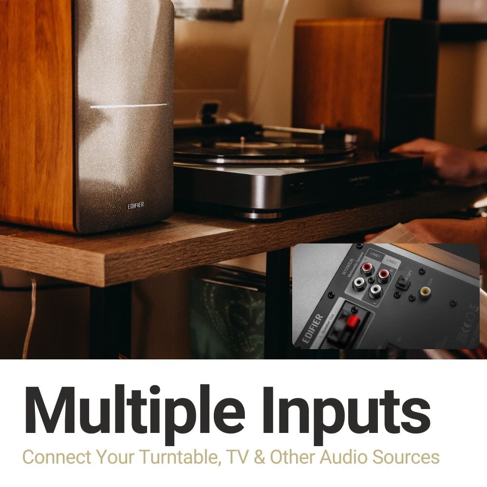 Achieve HD audio with the help of the optical and coaxial inputs which are additions to the R1280DB Bluetooth speakers.